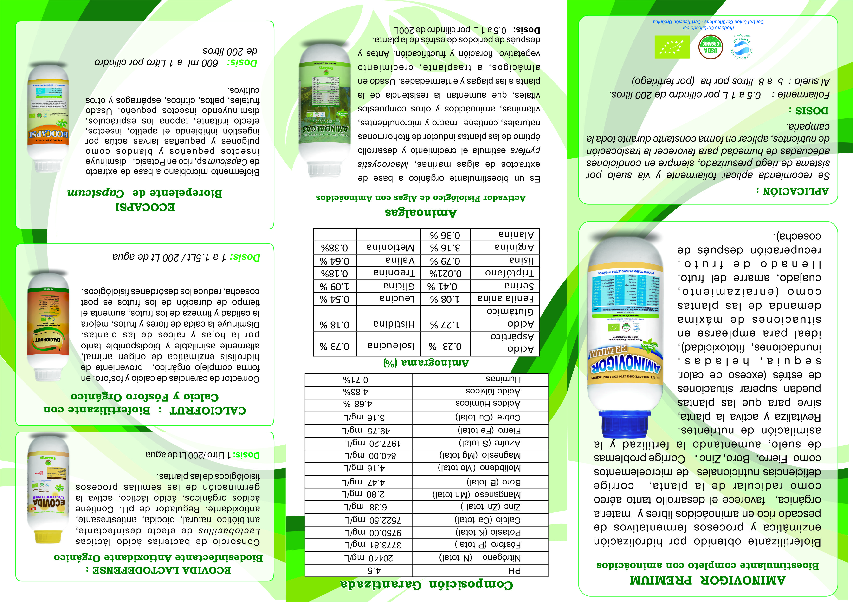 Aminovigor Premium es rico en aminoácidos biológicamente activos, péptidos, ácidos orgánicos, vitaminas, materia orgánica liquida, microorganismos benéficos, enzimas, macro y micro elementos en forma asimilable, es un activador de los procesos fisiológicos de la planta, además en un regulador natural del equilibrio nutricional mejorando el crecimiento y desarrollo de las plantas, revitaliza y activa a las plantas después de situaciones de estrés biótico y abiótico. Incrementa la actividad fisiológica y fotosintética de la planta. Mejora el crecimiento y desarrollo de las plantas. Asegura una floración concentrada y vigorosa. Aumenta la fertilidad, cuajado y amarre de los frutos. Promueve el incremento de las defensas naturales de la planta contra las plagas. Regula el equilibrio hídrico de las plantas superando condiciones de sequias e inundaciones. Potencia las coloraciones intensas y dulzor de los frutos. Incremento del rendimiento y calidad de las cosechas.