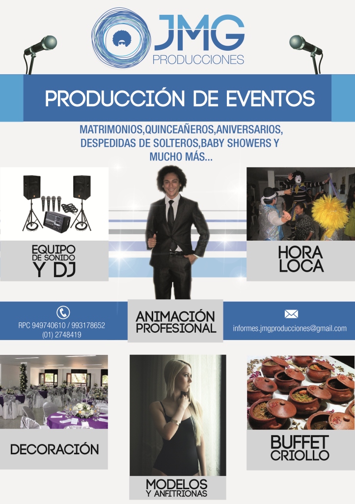 "JMG Producciones" es una empresa dedicada a la realización de todo tipo de eventos, buscando la satisfacción total de sus clientes. Cuenta con amplia experiencia y trabaja con los mejores profesionales del rubro.