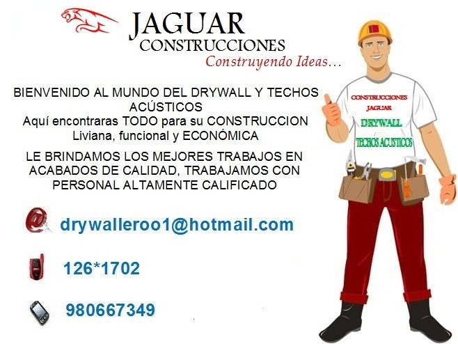 Somos JAGUAR CONSTRUCCIONES, una empresa de servicios en construcciones en DRYWALL Y TECHOS ACUSTICOS, especializada en estructuras de construcción, techos de policarbonato, divisiones interiores, baños, cocinas, detalles curvos en drywall, techos acústicos, baldosas, electricidad, pintura, estucado. Sólida experiencia comprobada en Obras. Especialistas en diseño y construcción de obras con el sistema drywall, para lo cual contamos con un personal técnico capacitado y experimentado en estructuras drywall, lo que nos permite ejecutar proyectos con empresas particulares, públicas, clientes individuales. Telefonos de contacto: 980667349 / 126*1702 / 981261702 / RPC 942784328 Correo electronico: drywalleroo1@hotmail.com