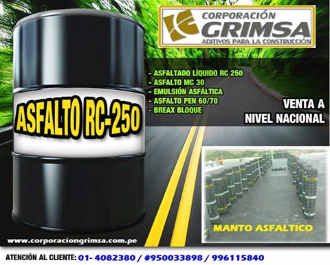 Ventas de asfalto rc-250 liquido en lima Peru. Ofrecemos en liquido imprimante MC-30, asfalto RC-250, para el preparado de mezcla asfaltica en caliente y frio, en cilindros de 55 galones.