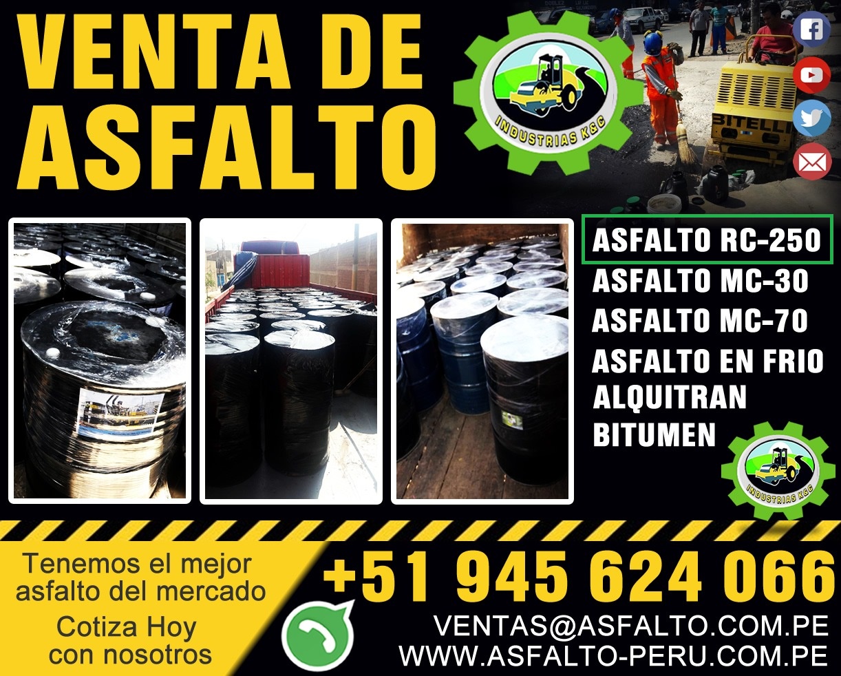INDUSTRIAS K & C SAC. RUC:20601353173 Somos una empresa dedicada ala compra y venta de Asfalto. se vende todo tipo de Asfalto Liquido: *Alquitrán *Emulsión Asfáltica *Asfalto Liquido MC- 30 *Asfalto Liquido RC- 250 *Cemento Asfáltico PEN 60/70 *Cemento Asfáltico PEN 85/100 *Cemento Asfáltico PEN 120/150 - Se realizan trabajos de imprimación, riego de liga etc. manualmente o con maquinaria, a cualquier lugar del país. - Envió de producto a provincia, material para asfaltado de pistas o para galpones de granja. o envia un mensaje al imbox. CONTACTOS : Teléfono Celular :945624066 / 988100191 CORREO: ventas@asfalto.com.pe FACEBOOK: https://www.facebook.com/asfaltosemulsiones/?fref=ts WEB: www.asfalto.com.pe