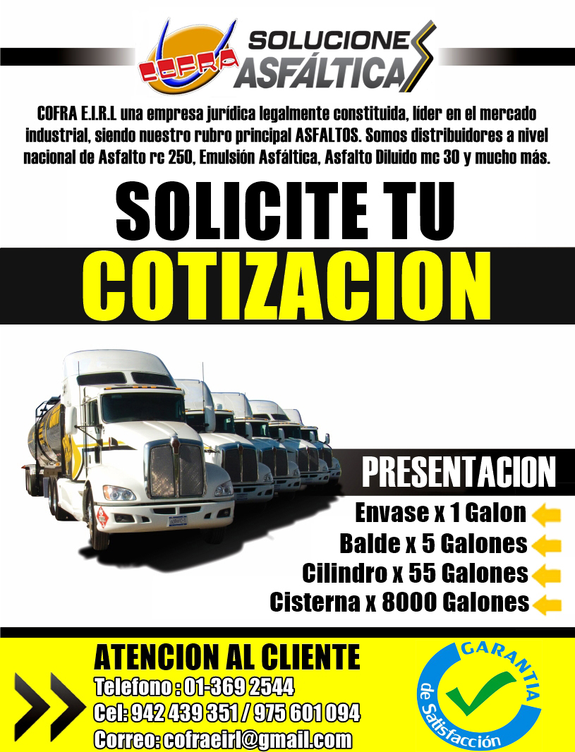 presentacionesenvase de 1 galonbalde de 5 galonescilindro de 55 galonescisterna 8,000 galonesproductos asfalticosasalto líquido rc 250asdalto diluido mc 30asfalto pen 60/70impermeabilizante para galponesimpermeabilizante contra el salitrebre liquida en cilindros de 55 galonescemento asfaltico pen 85/100brea solido en bloques de 14 kilosmembrana asfaltica o manto asfalticoalquitra impermeabilizanteemulsion asfaltico de lenta y rapidacemento asfaltico pen 60/70barreda de vaporemulsion asfaltica css-1hpintura para tráficomicroesferas de vidrioserviciosasfaltado en generaljuntas de dilatacioncarpeta asfaltica 1, 2,3señalizacioninstalacion mantos asfalticossolicita tu cotizacionrpm: #942439351 cel: 942439351 / 975601094correo: cofraeirl@gmail. Com