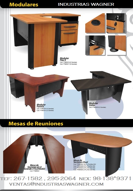 Somos una empresa, de carácter dinámico e innovador que se abre camino a través del trabajo honesto y eficiente, brindando a sus clientes la oportunidad de beneficiarse con las mejores ofertas del mercado local. Nos especializamos en la fabricación de mobiliario de oficina y equipamiento integral, somos INDUSTRIAS WAGNER E.I.R.L. con el R.U.C. 20520800451, domiciliados en el PARQUE INDUSTRIAL–VILLA EL SALVADOR- LIMA-LIMA. Nuestra empresa tiene por objeto dedicarse a la fabricación, comercialización y venta de mobiliario de oficina y equipamiento integral con insumos importados y nacionales de primera calidad. Con la tecnología y el personal altamente capacitado asegurando un producto y un servicio de muy buena calidad logrando la completa satisfacción de nuestros clientes. Cualquier consulta a: Jesús García M. Ventas TEF: 01-295-2064; 01-267-1582 NEX: 99-416*4292; 98-138*9371 E-mail: Jgarcia@industriaswagner.com ventas@industriaswagner.com Vea nuestros productos en: www.industriaswagner.com ¿Que vende y fabrica INDUSTRIAS WAGNER? ü Escritorios gerenciales ü Escritorios secretariales ü Caunters de recepción ü Módulos de ventas ü Estantes archiveros ü Archivadores con gavetas ü Estantes libreros ü Credenzas ü Mesas de reuniones ü Mesas de conferencia ü Butacas de auditorio ü Mesas de impresoras ü Computo estantes ü Sillas digitadora ü Sillas operativas ü Sillas ejecutivas ü Sillones gerenciales ü Sillones presidenciales ü Tándem de 4-3-2 usuarios ü Sillas de confidente ü Sillas de espera ü Sillas fijas ¿Qué servicios me brindan INDUSTRIAS WAGNER? ü ASESORAMIENTO DE DISEÑO ü ASESORAMIENTO DE INVERCION ü REDUCCION DE INVERCION ECONOMICA ü MEJORES PLAZOS DE ENTREGA DE (2 a 4 días ) ü STOCK PERMANENTE ü UNA GRAN VARIEDAD DE COLORES ü DISEÑOS EXCLUSIVOS ü GARANTIA HASTA POR 24 MESES ü MEJORAMIENTO Y RENOVACION DE LA IMAGEN CORPORATIVA ü OPTIMIZACION DE ESPACIOS LABORABLES ü SERVICIO TECNICO ü SERVICIO DE FLETE A TODO EL PERU ü PRESENTACION DE PROPUESTAS : A – B –C ü FABRCAMOS LO QUE USTED NECESITE A MEDIDA AL GUSTO DEL CLIENTE. ü TRABAJOS CON PLANOS Y PROYECTOS, AUTOCADCON INGENIEROS.