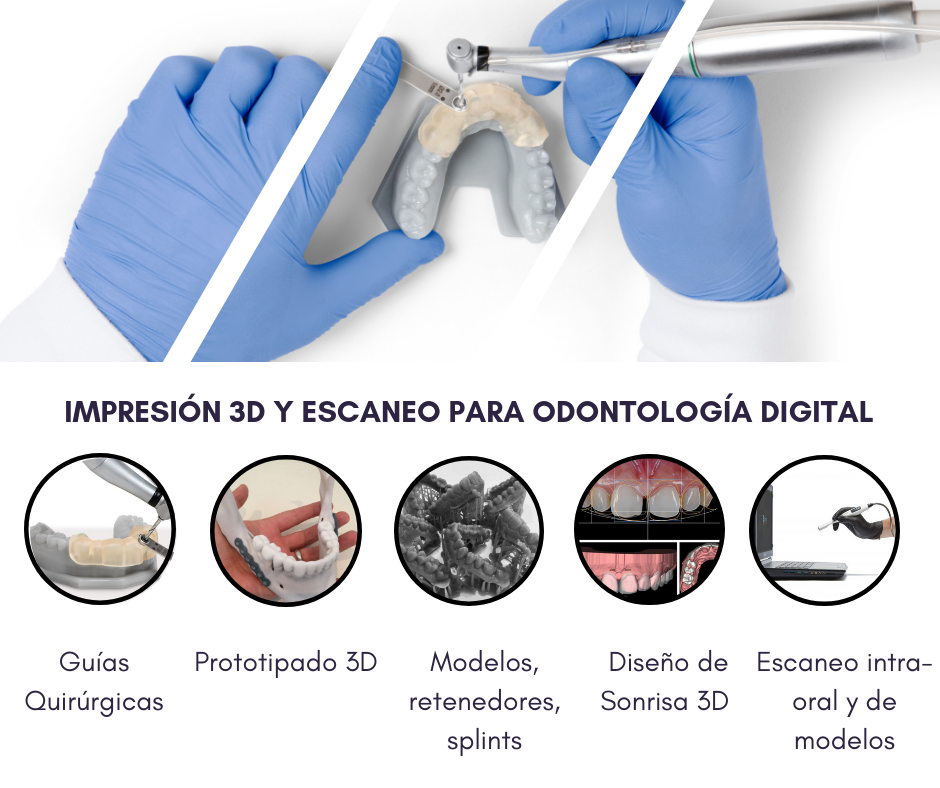 El flujo de trabajo de la odontología digital Pasa de escaneos de pacientes a impresiones 3D a productos dentales listos para usar en cuestión de horas, usando estos pasos básicos. Diseño y Escaneado Obtención digital de datos anatómicos utilizando un escáner intraoral o escáner óptico de escritorio para la dentición del paciente. Para tratamientos que lo requieran, utilice un escáner CBCT para la osteotomía del paciente. Diseñe los productos dentales deseados integrando los datos anatómicos en el software de CAD dental y planifique cuidadosamente el tratamiento. Impresión 3D y Preparación A continuación, cargue y prepare modelos dentales a través del software e imprima . Enjuague las piezas En IPA, post-curar y quitar soportes, ligeramente lijar y pulir las piezas. Para productos dentales específicos, ensamble los modelos impresos con accesorios prefabricados, tales como tubos de guía metálicos para plantillas quirúrgicas. O, utilice modelos impresos para fabricar otras piezas, tales como alineadores formados al vacío.